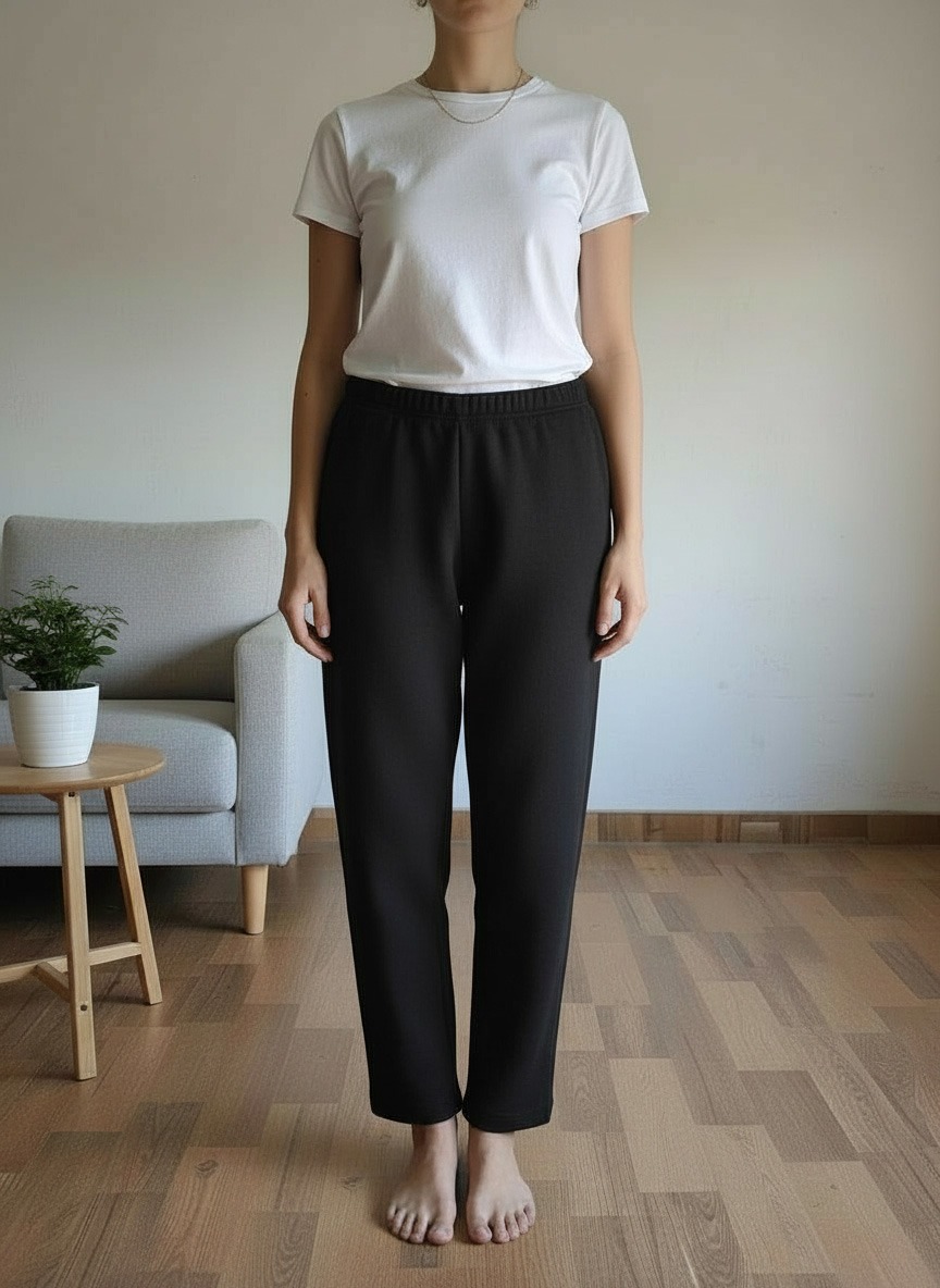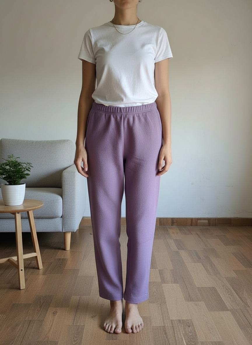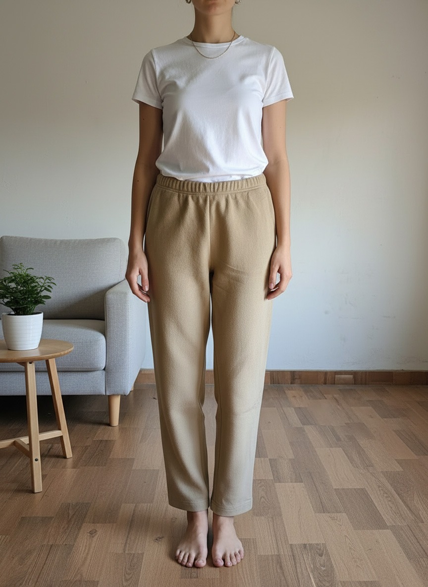 The straight-leg cut provides ample room through the thighs and calves, allowing for free movement and making these pants suitable for casual outings, travel, or at-home lounging. Their neutral beige shade pairs smoothly with a wide range of tops and footwear, from simple T‑shirts and kurtis to light sweaters and sandals. Ideal for someone who values comfort over formality, these pants are best styled in relaxed, indoor or semi-casual settings where an easygoing, unpretentious appearance is preferred.