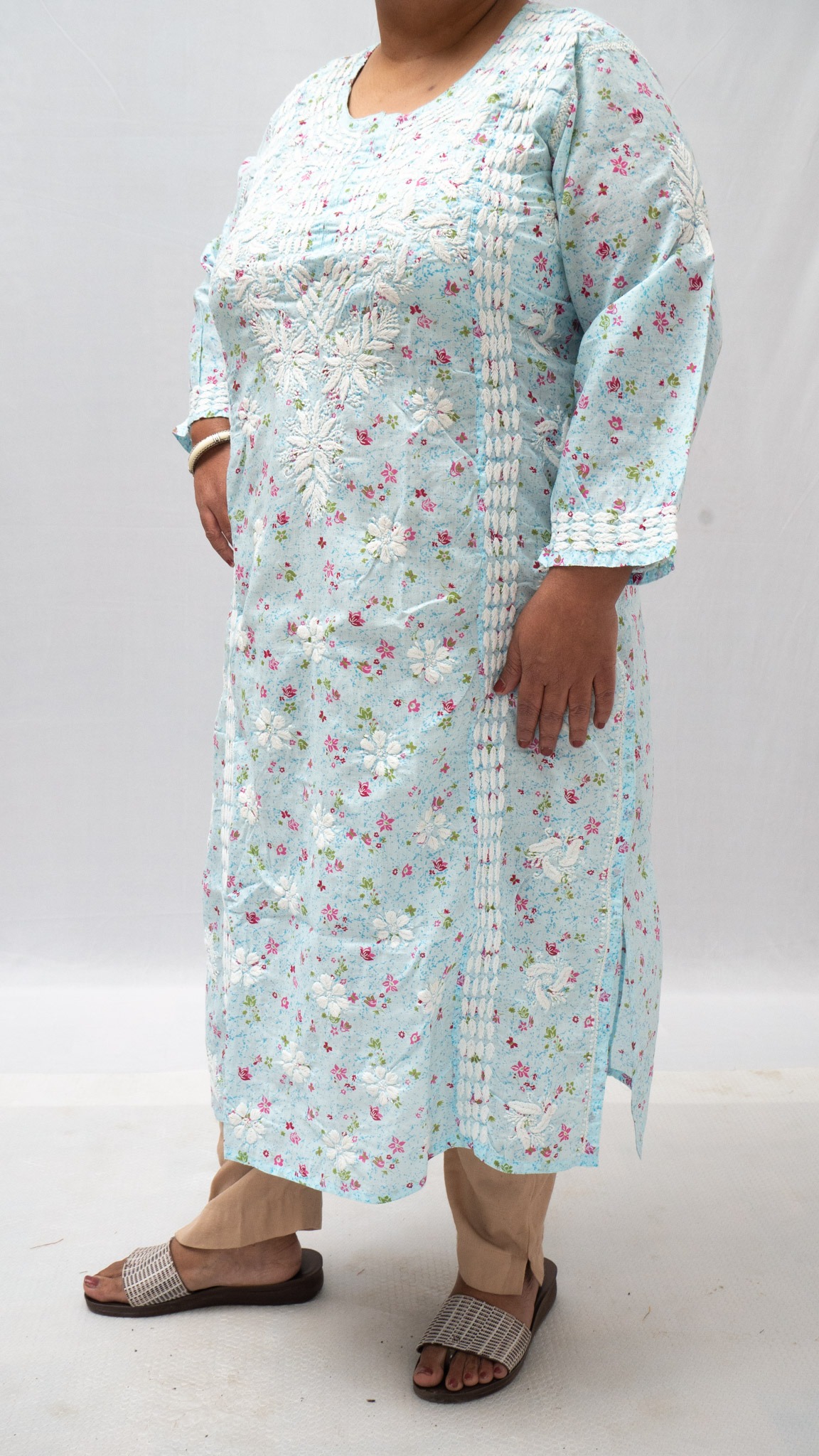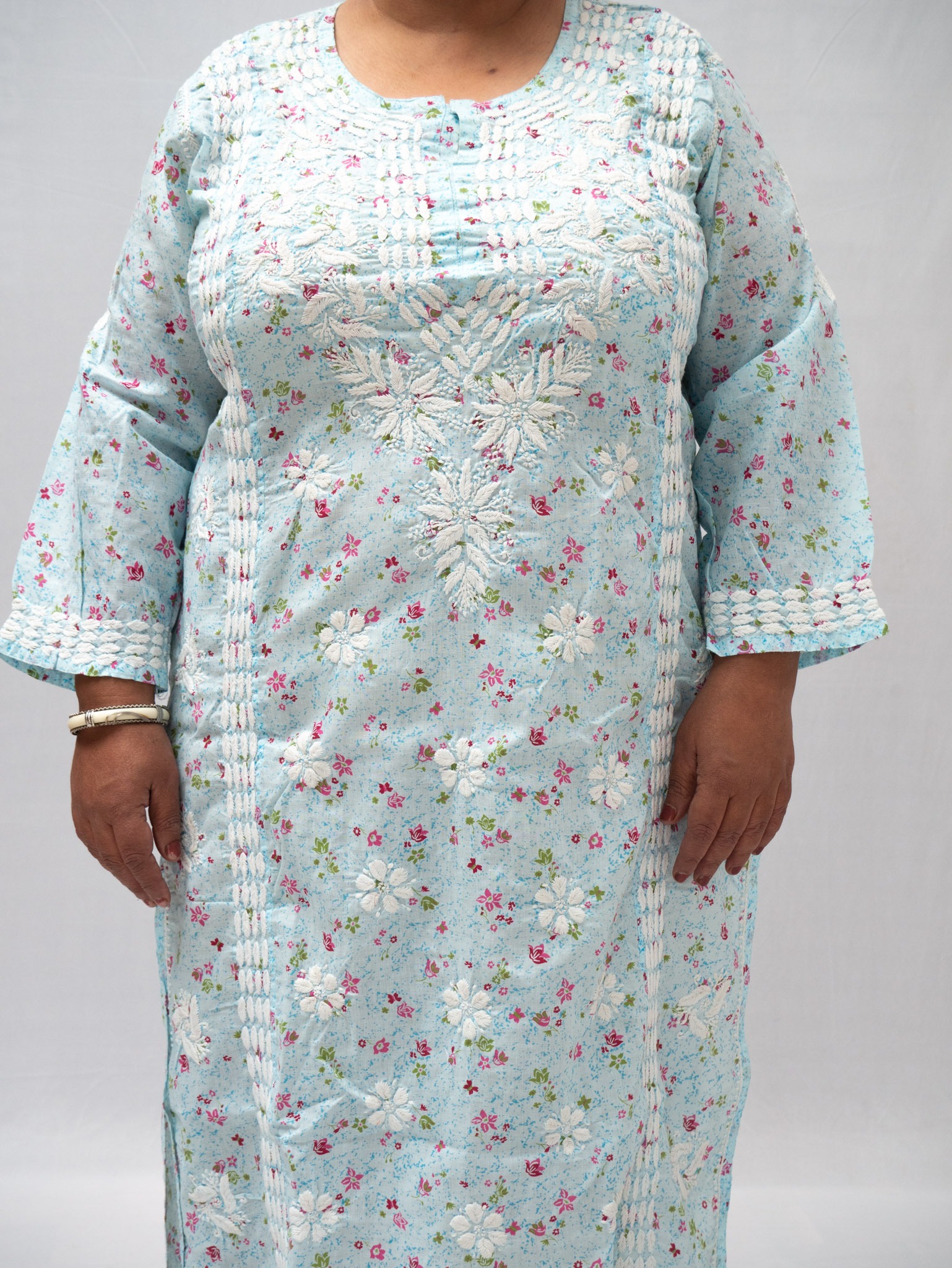 A soft cotton kurta blooming with delicate Chikan embroidery and floral prints. Lightweight, breathable, and effortlessly elegant — perfect for sunlit strolls or serene gatherings.
