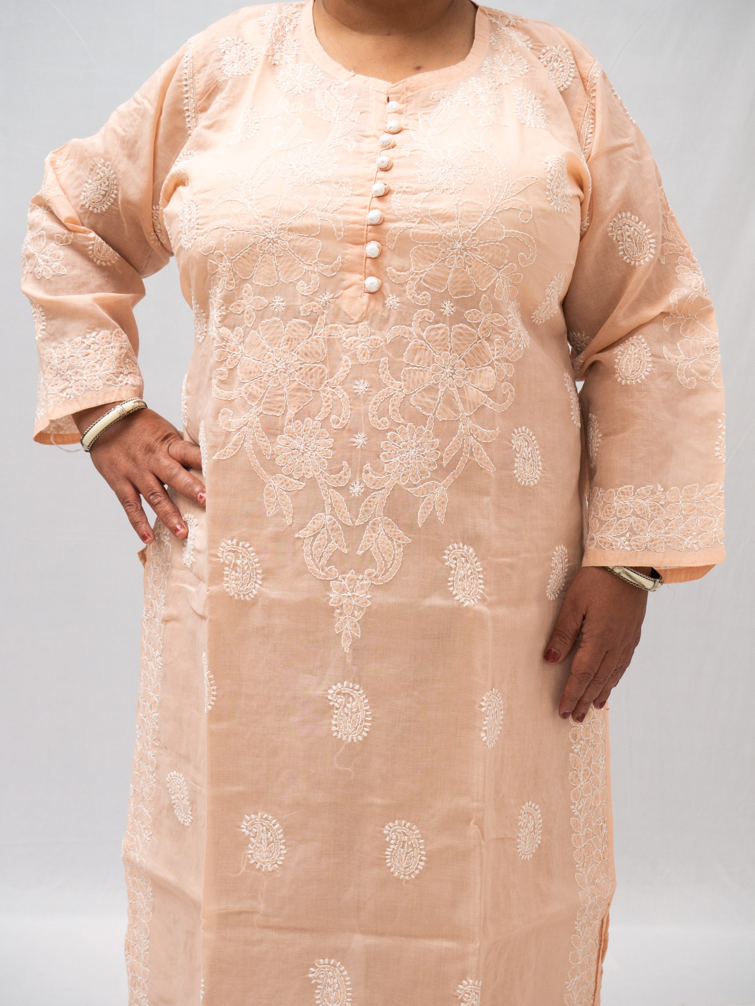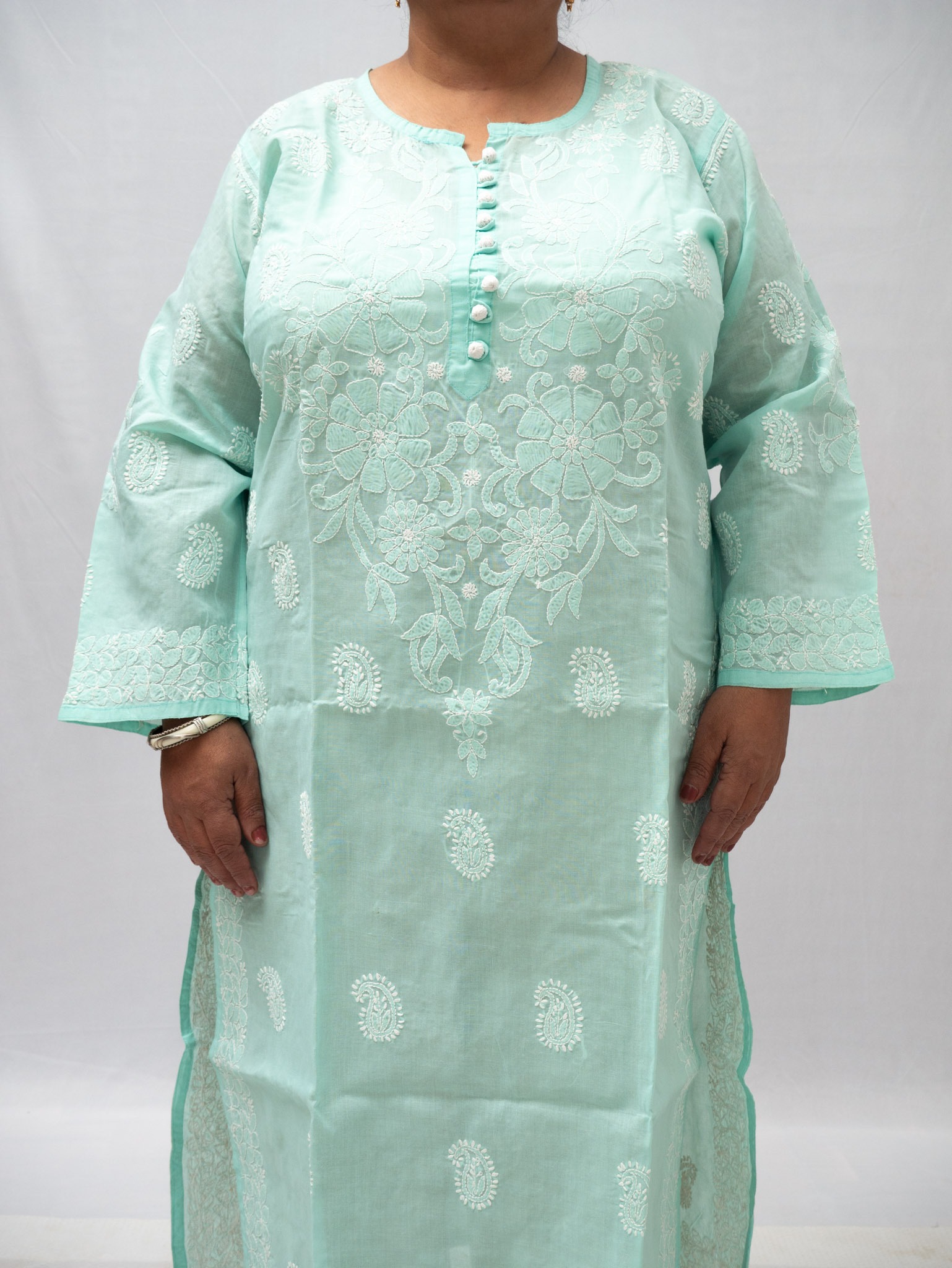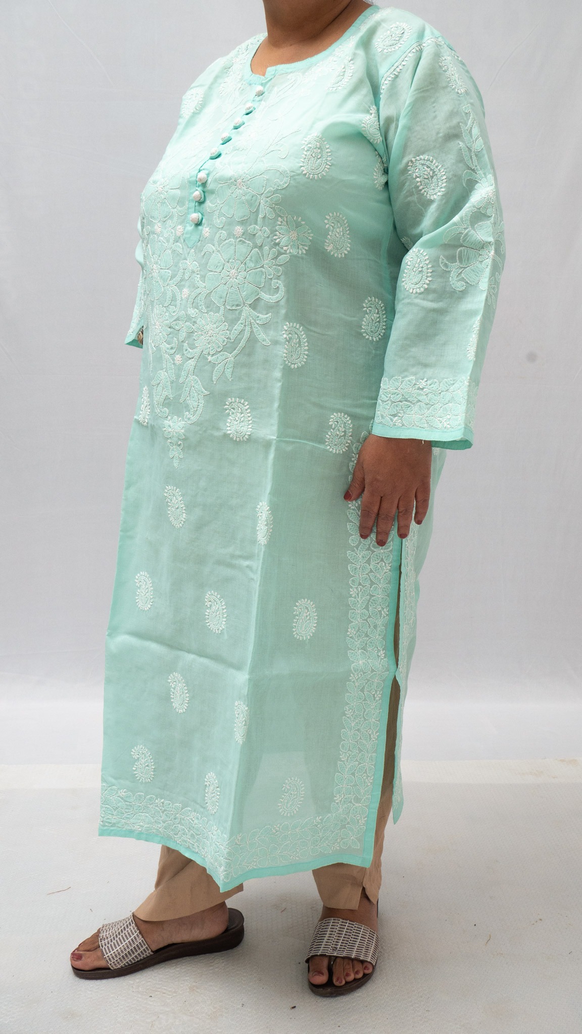 Celebrate timeless elegance with this plus-size aqua blue cotton kurta, adorned with classic chikan embroidery in intricate floral and paisley patterns. Crafted from breathable cotton, this kurta features exquisite white threadwork throughout the front, sleeves, and borders, complemented by stylish buttons at the neckline for a contemporary touch. The relaxed silhouette and side slits ensure ease of movement and a flattering fit, making it ideal for everyday wear or festive occasions. Pair it with neutral bottoms and simple accessories to complete the chic look. Designed for comfort and confidence, this kurta beautifully blends traditional artistry with modern styling.