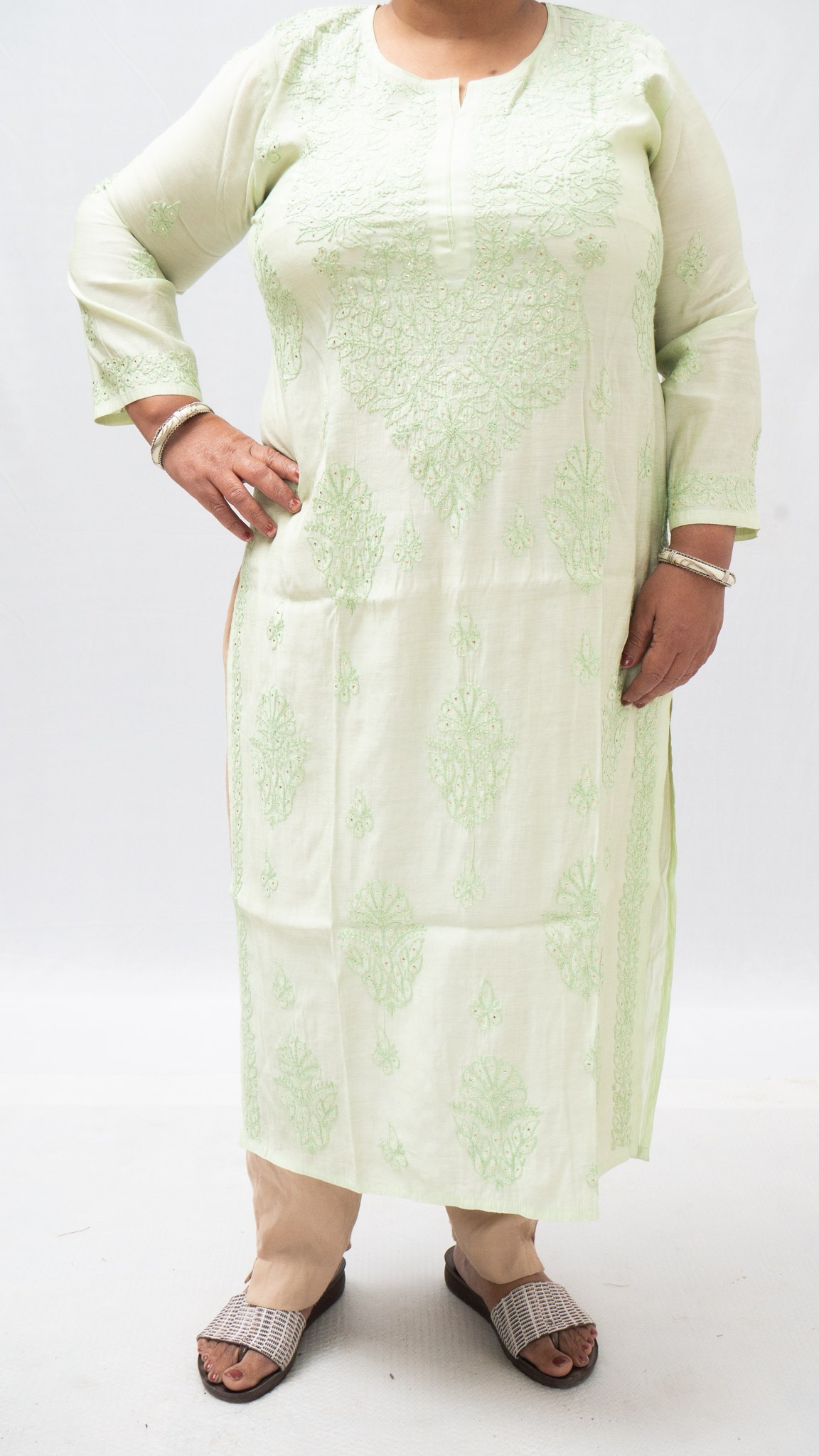 This light green Chikan kurti is a whisper of elegance, woven with heritage and grace. Crafted in a soft, sunlit hue, it features intricate embroidery in a slightly deeper yellow thread—creating a subtle yet striking play of texture. The symmetrical patterns across the chest, sleeves, and hem showcase classic floral and paisley motifs, echoing the finesse of Lucknowi craftsmanship. With its full sleeves and round neckline, the silhouette remains effortlessly refined. Paired with beige pants and open-toe sandals, this kurti is perfect for daytime gatherings, festive mornings, or quiet celebrations. A piece that speaks softly, yet leaves a lasting impression.