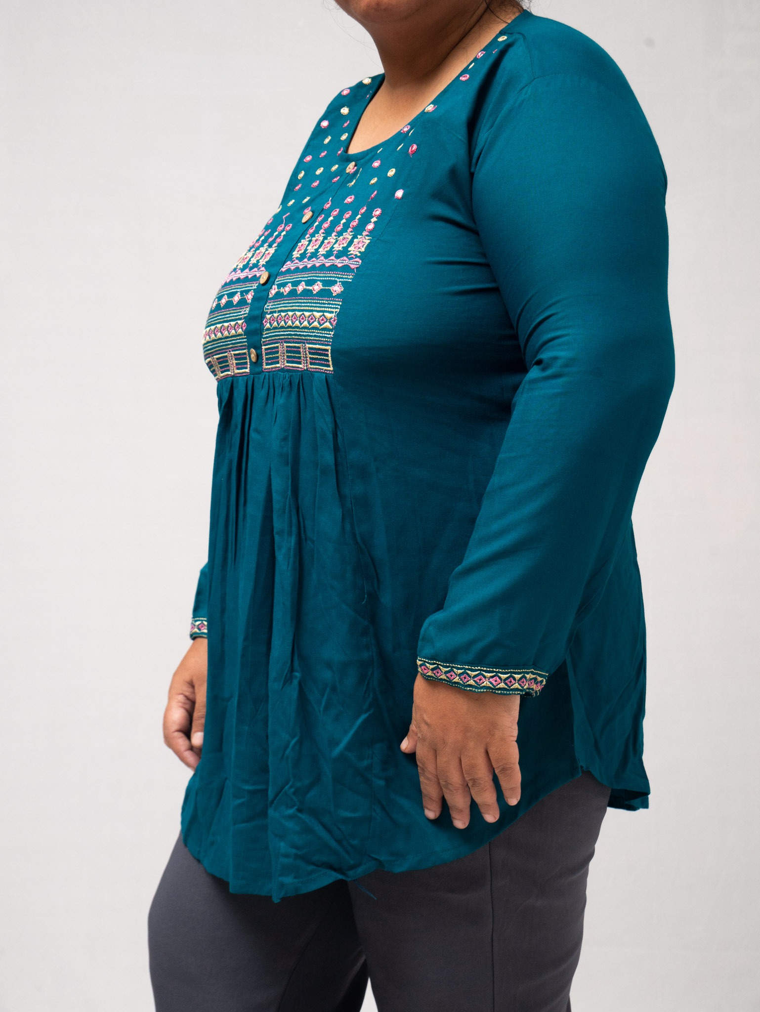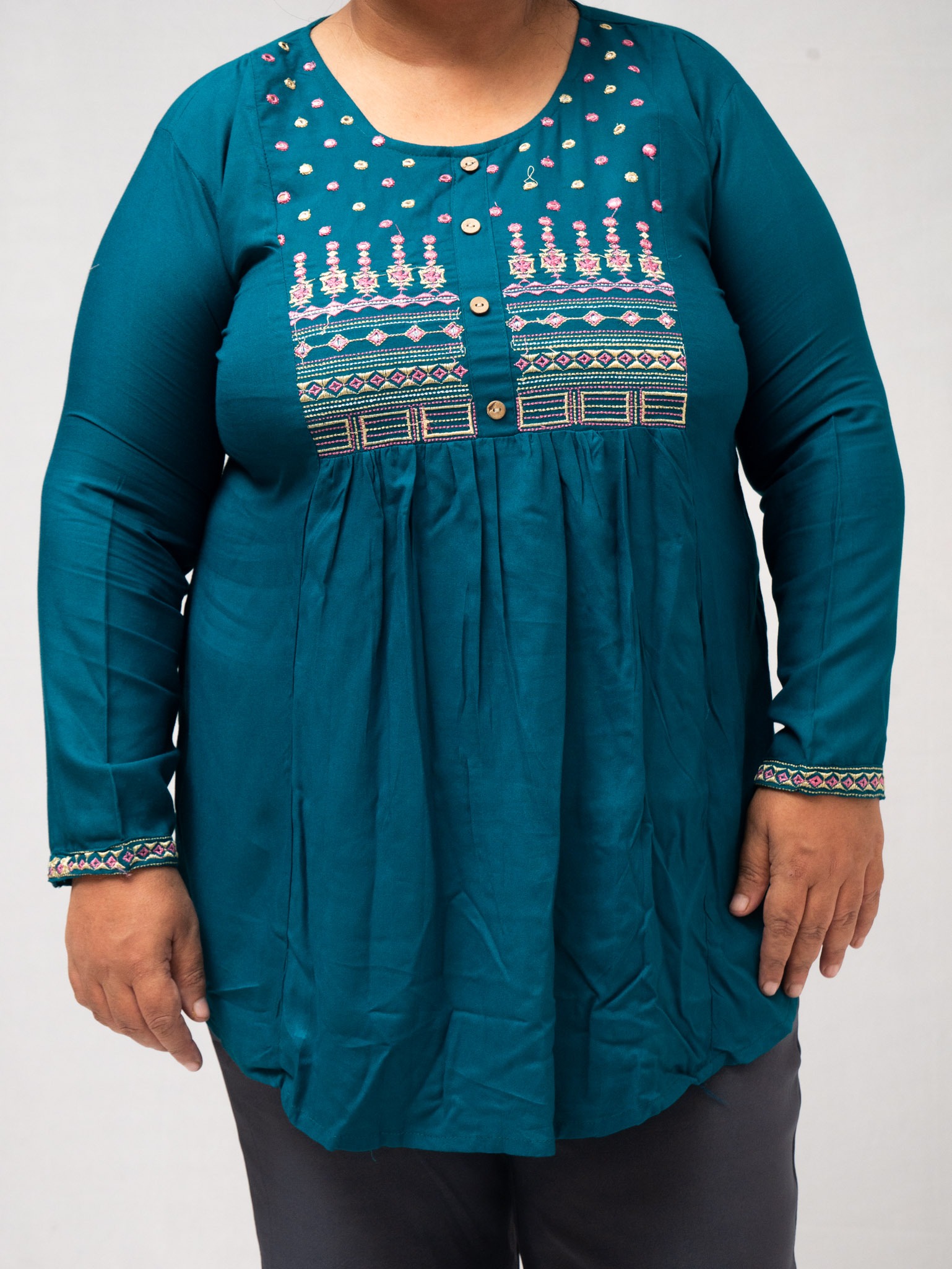 Beautiful Plus size Rayon Kurti in Teal Bloom color with delicate floral embroidery and lace trim detailing on the front Made from high-quality rayon.