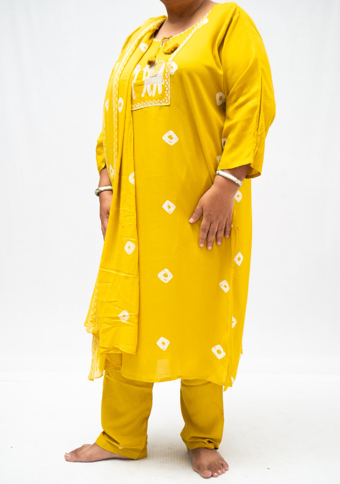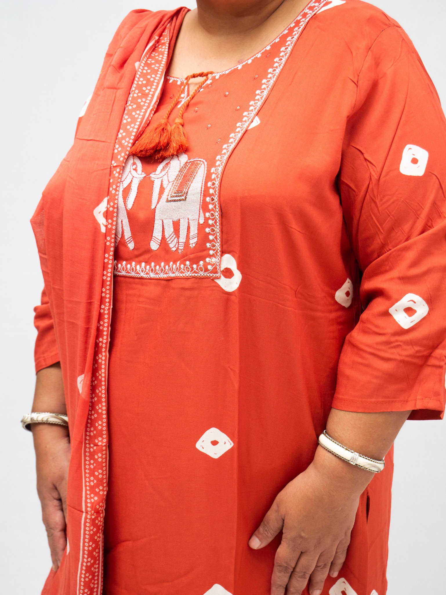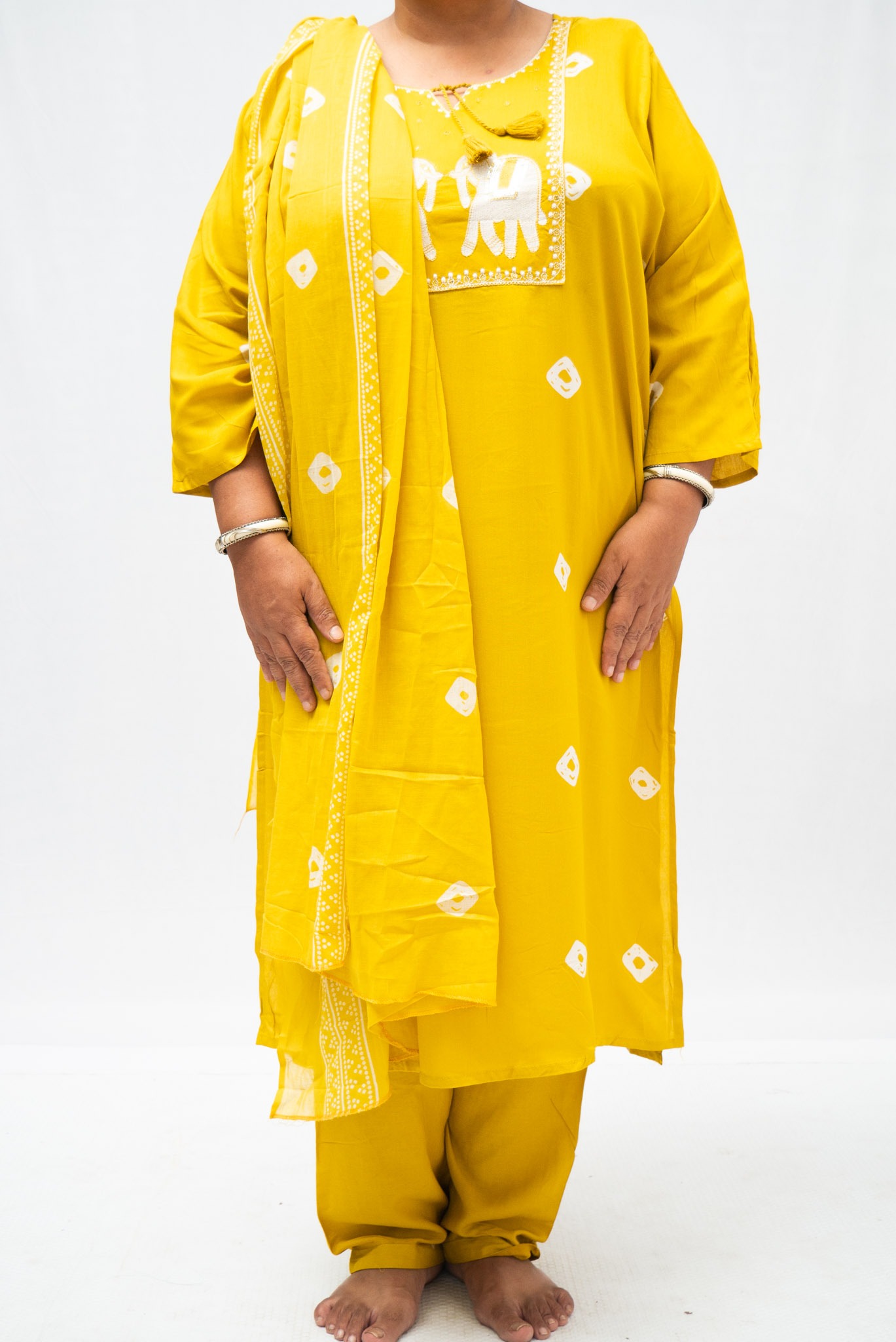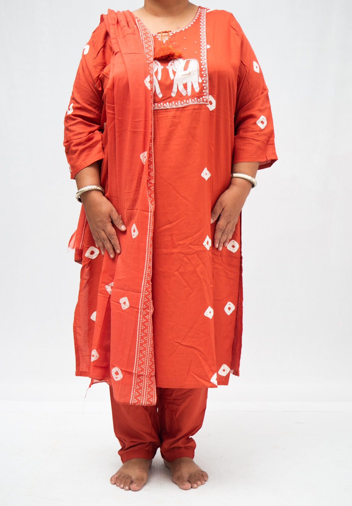 Celebrate everyday elegance with the Garima Kurti Set, a thoughtfully designed cotton salwar kurta ensemble that brings comfort and culture together. The kurta features an A-line silhouette adorned with delicate block-printed motifs and a signature elephant design at the neckline—symbolizing strength and serenity. Decorative borders along the neckline and sleeves add a refined touch, while the three-quarter sleeves offer ease and modesty.