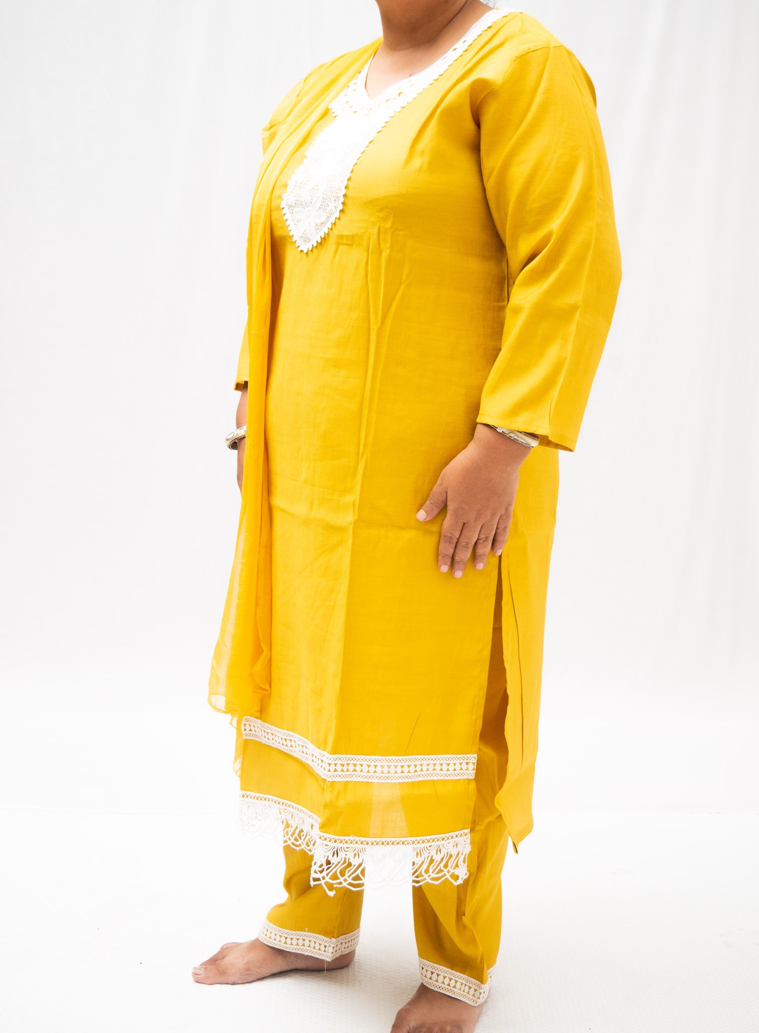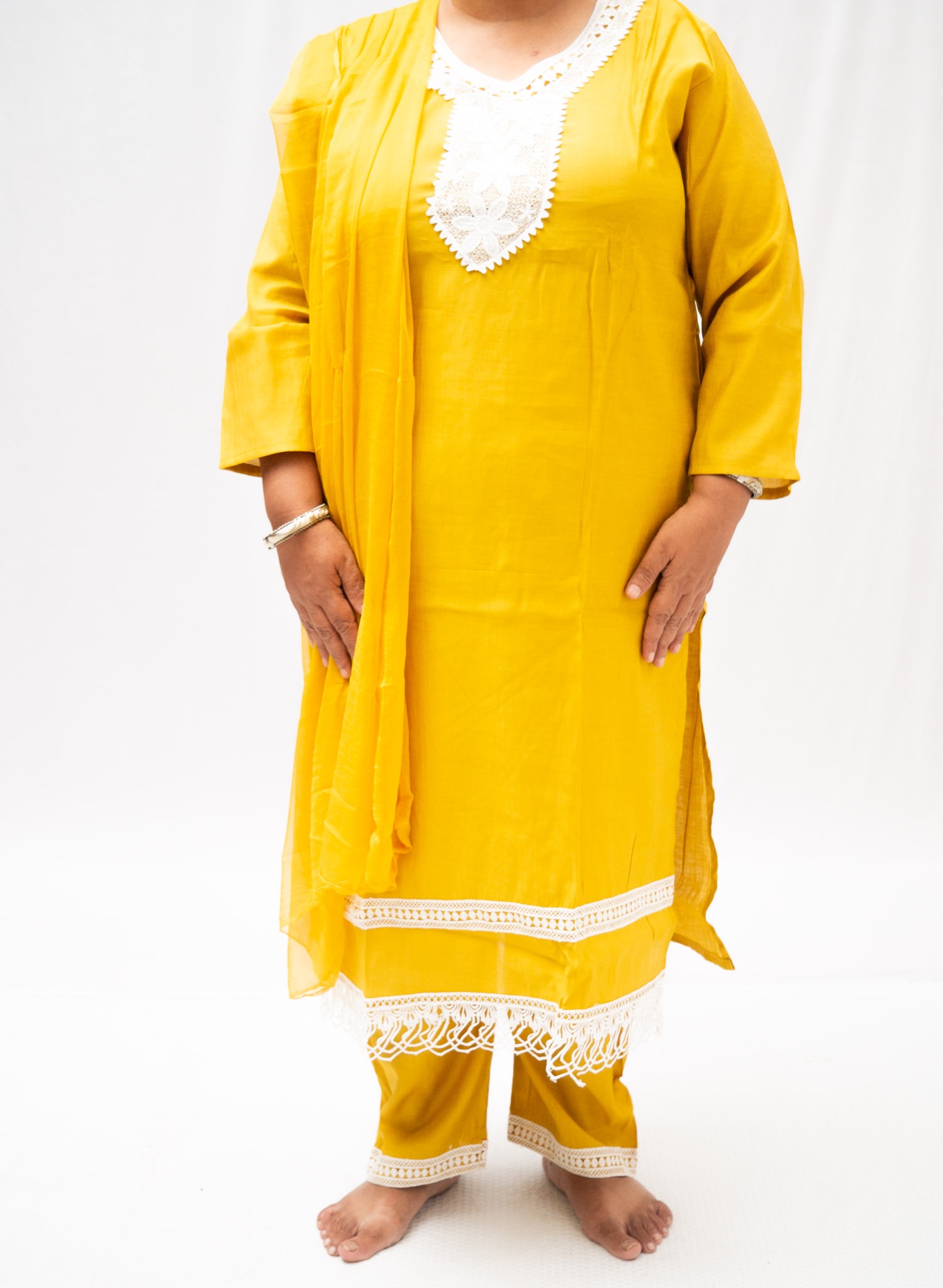 The salwar is tailored for ease, with matching lace and fringe at the ankles that echo the kurta’s trim. Completing the ensemble is a soft, lightweight dupatta that drapes effortlessly, adding movement and grace. Whether you’re celebrating at home or attending a cultural event, it offers timeless sophistication with a poetic touch.