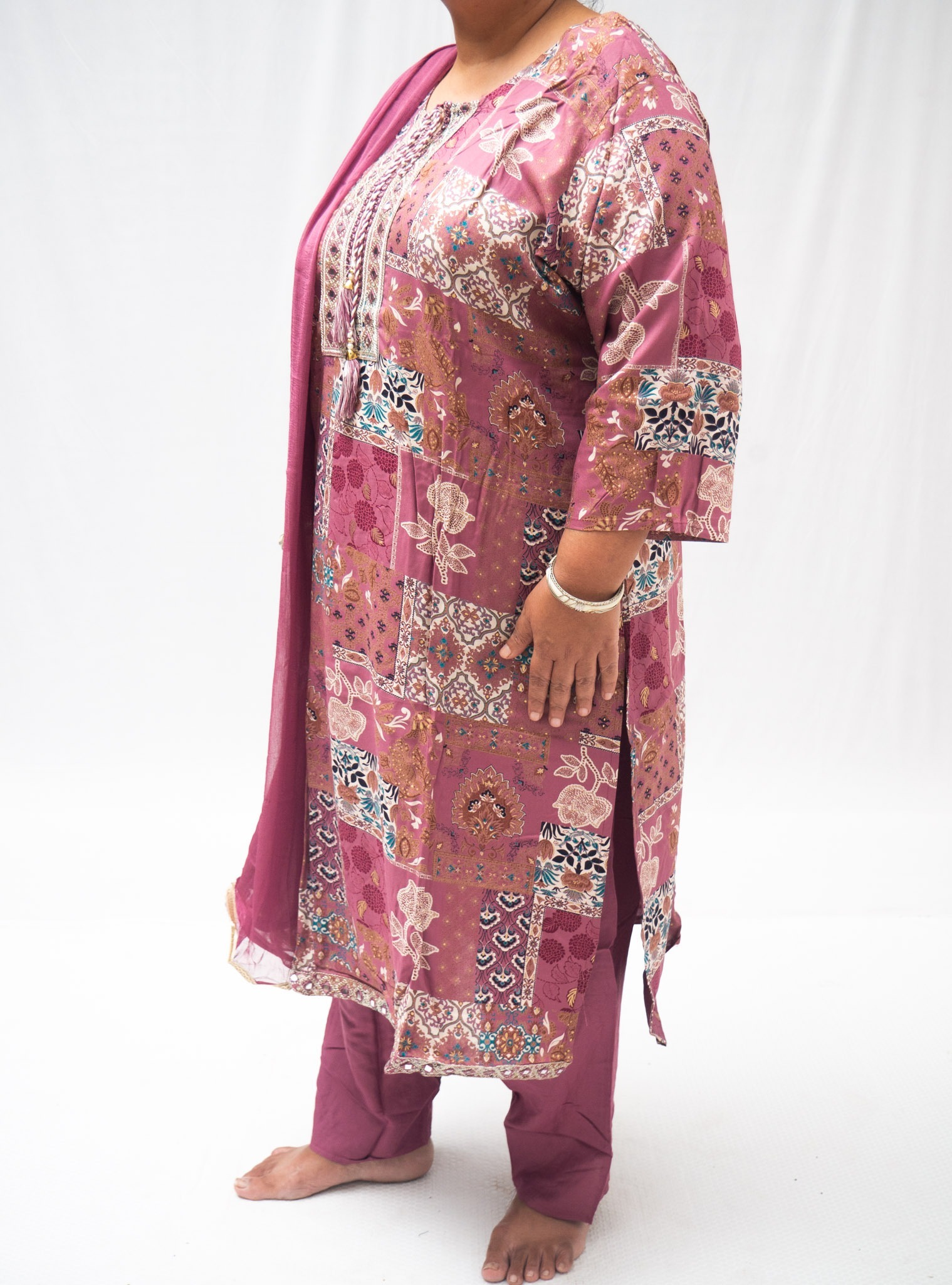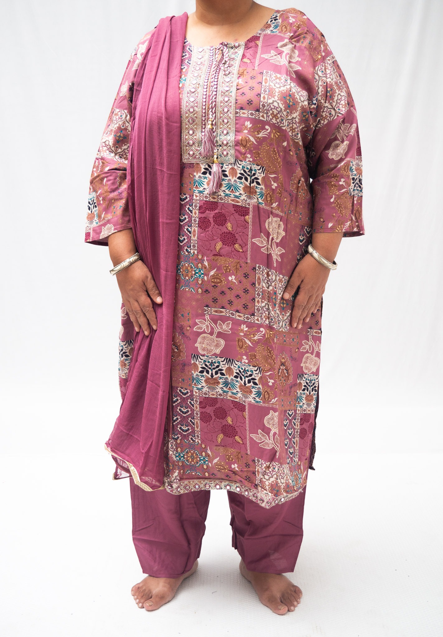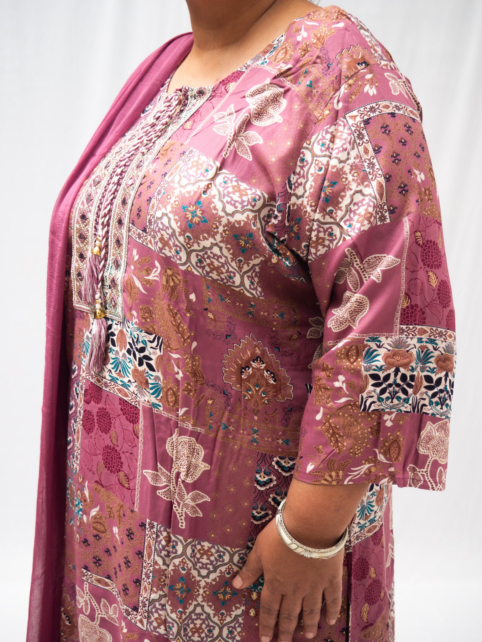 Celebrate heritage with Pratha, a salwar Kurta set that blends traditional motifs with contemporary charm. The kurta showcases a patchwork-style print combining floral, paisley, and geometric elements in earthy tones. Its neckline is adorned with intricate embroidery and mirrorwork, forming a vertical panel that adds texture and elegance. A pair of tassels completes the look with a playful touch.