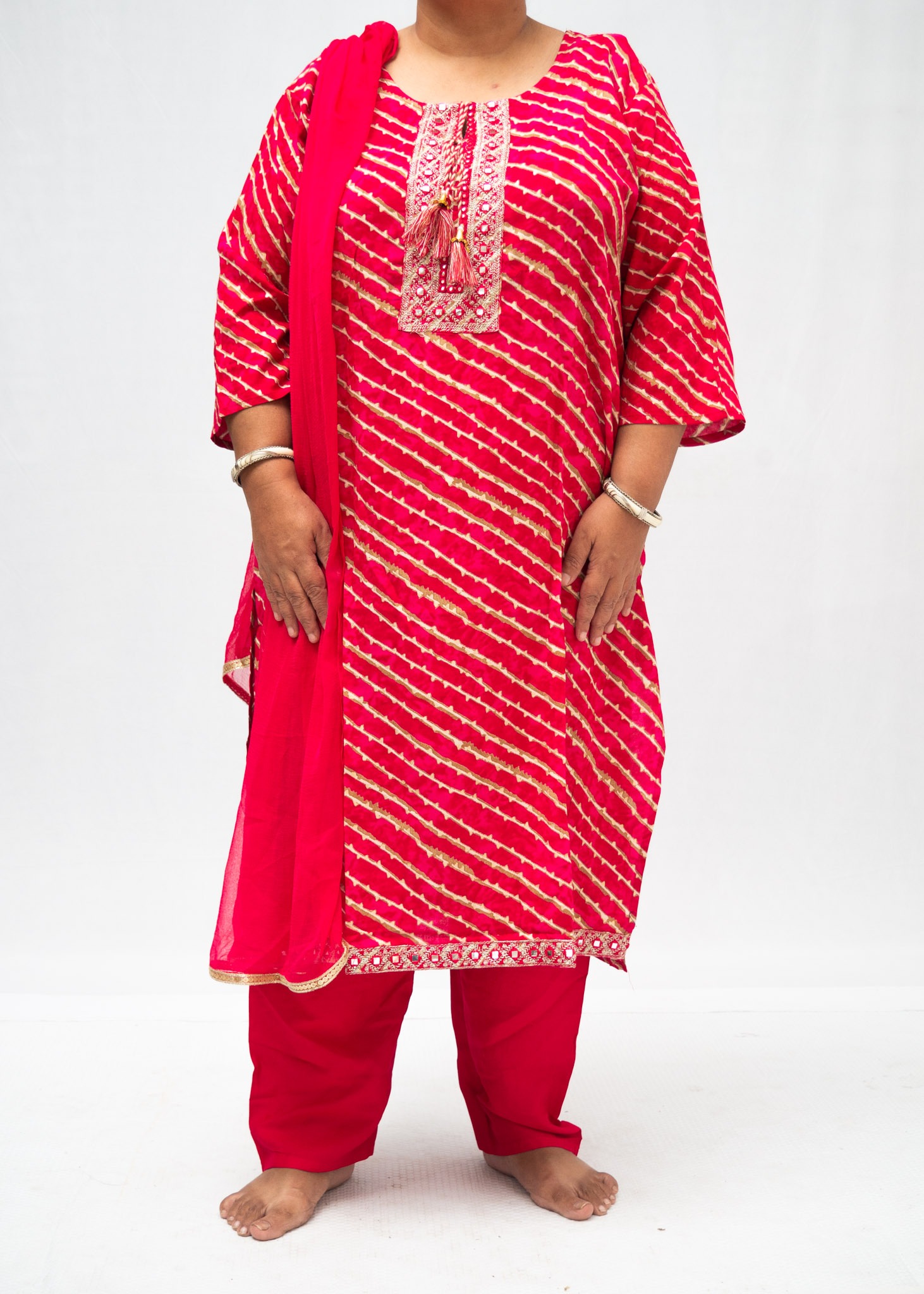 Turn heads in this radiant green salwar kurta with dupatta , featuring diagonal orange stripes and golden motifs. Paired with a matching dupatta, it’s a perfect blend of tradition and bold elegance.