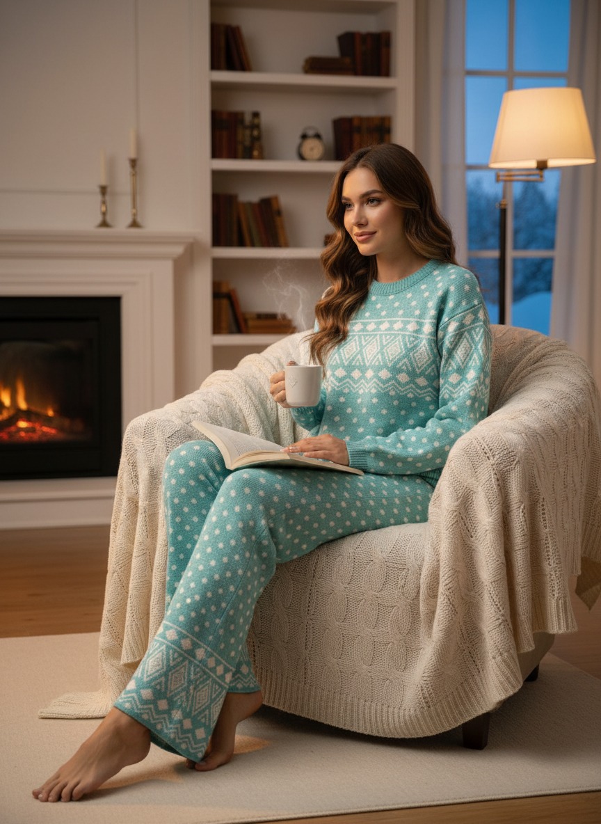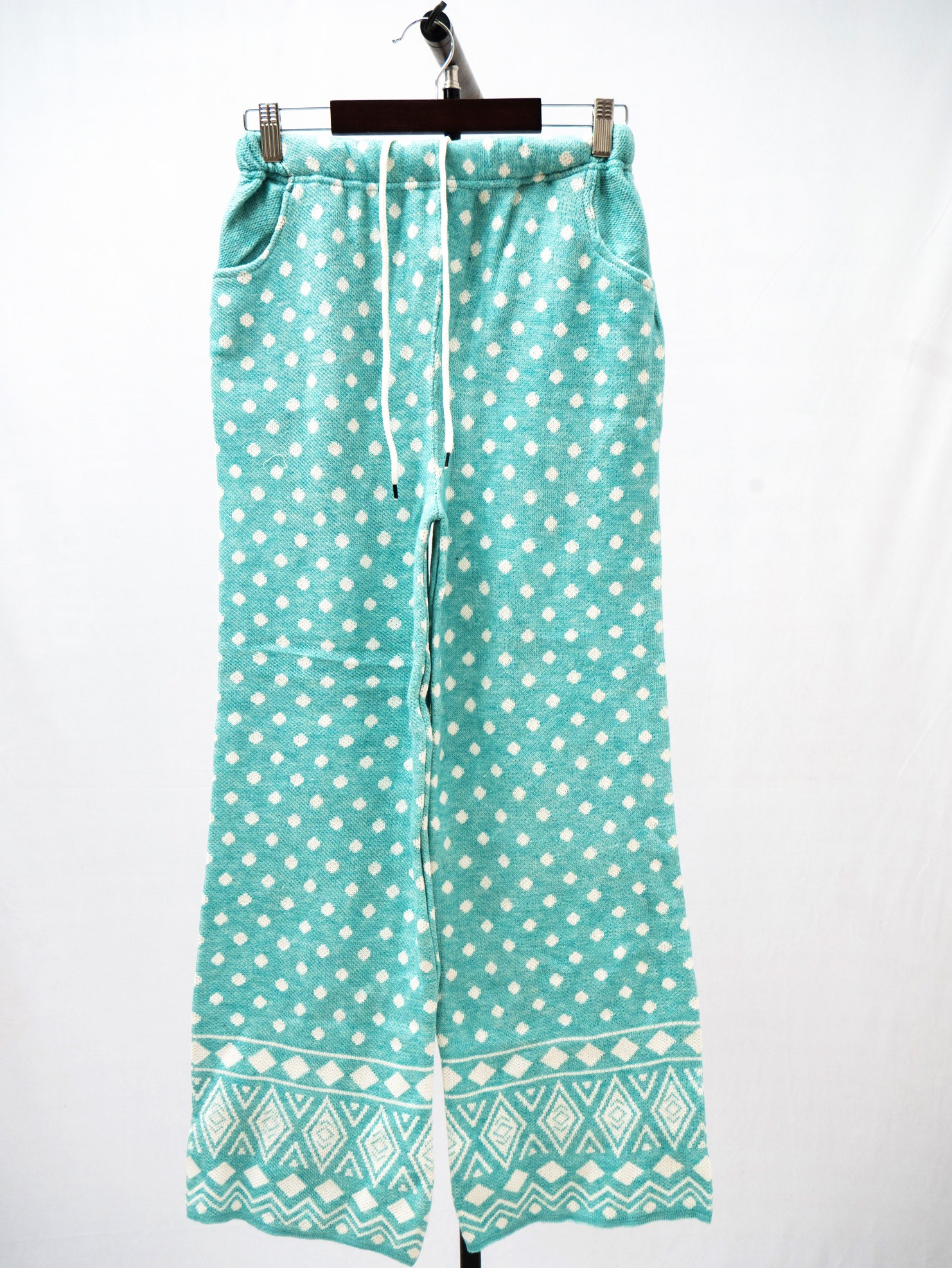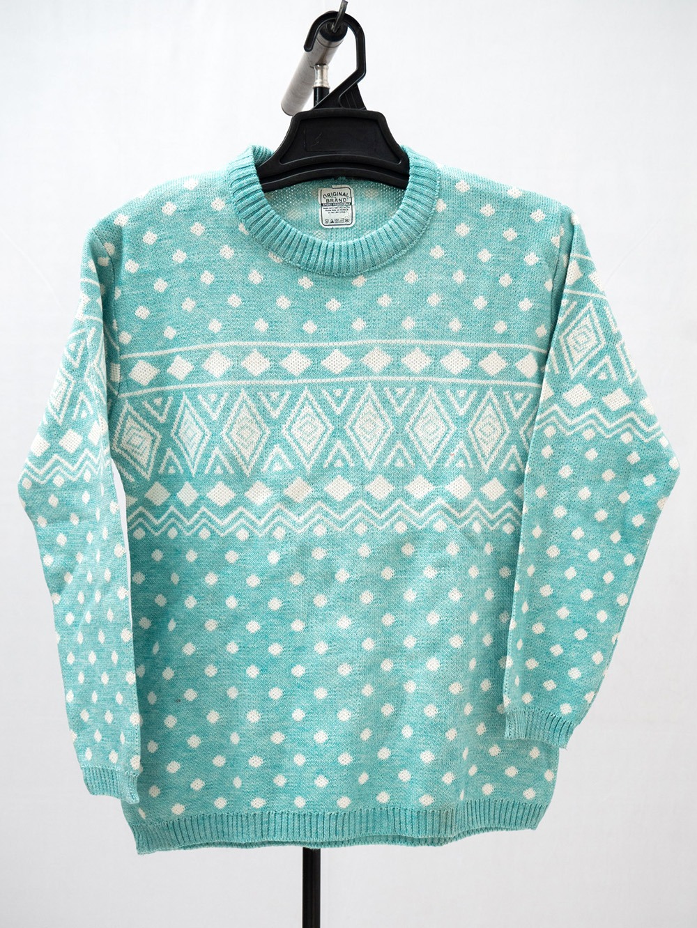 Wrap yourself in warmth and whimsy with this teal woolen co-ord set—a harmonious blend of comfort and charm. The knitted sweater features a cascade of white polka dots and a central band of zigzags and diamonds, evoking the rhythm of folk embroidery. Paired with matching drawstring pants that echo the same motifs along the hem, this set offers both snug elegance and everyday ease. Ribbed cuffs and hems ensure a flattering fit, while side pockets add a touch of practicality. Whether you’re sipping chai on a misty morning or heading out for a casual meet-up, this ensemble whispers softness and style in every stitch.