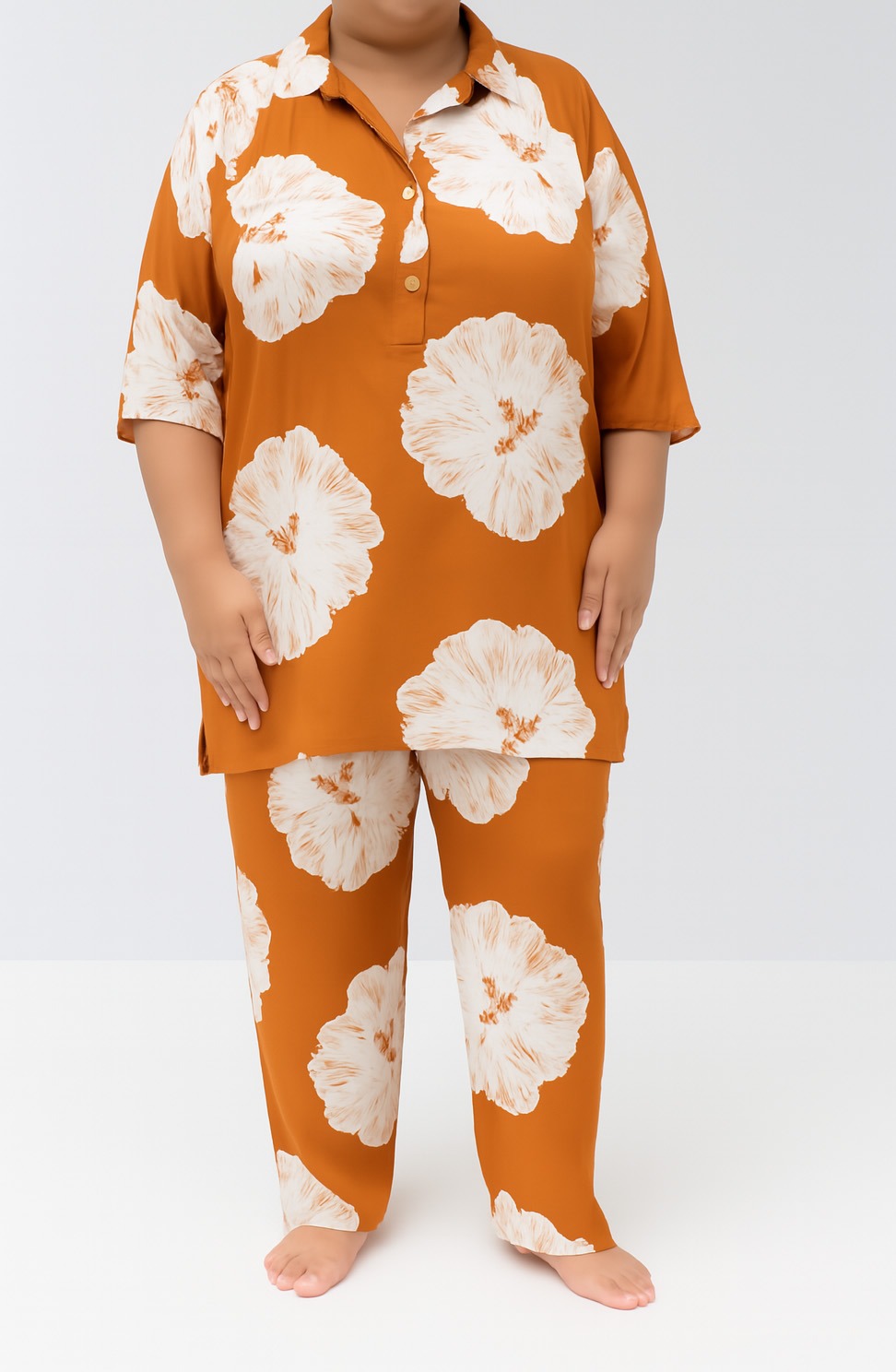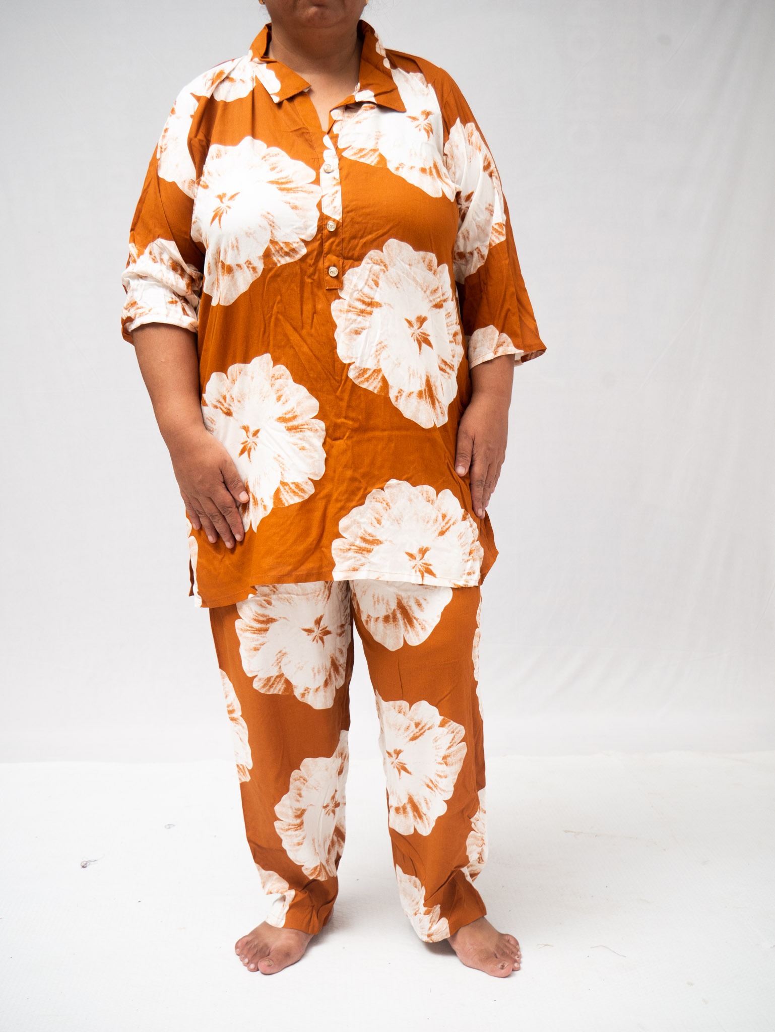 Plus size Co-ord Set in Burnt Orange with leaf Pattern print