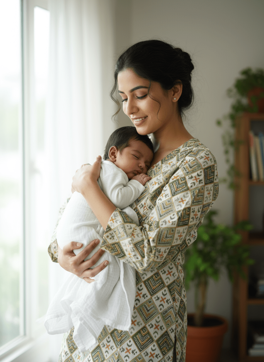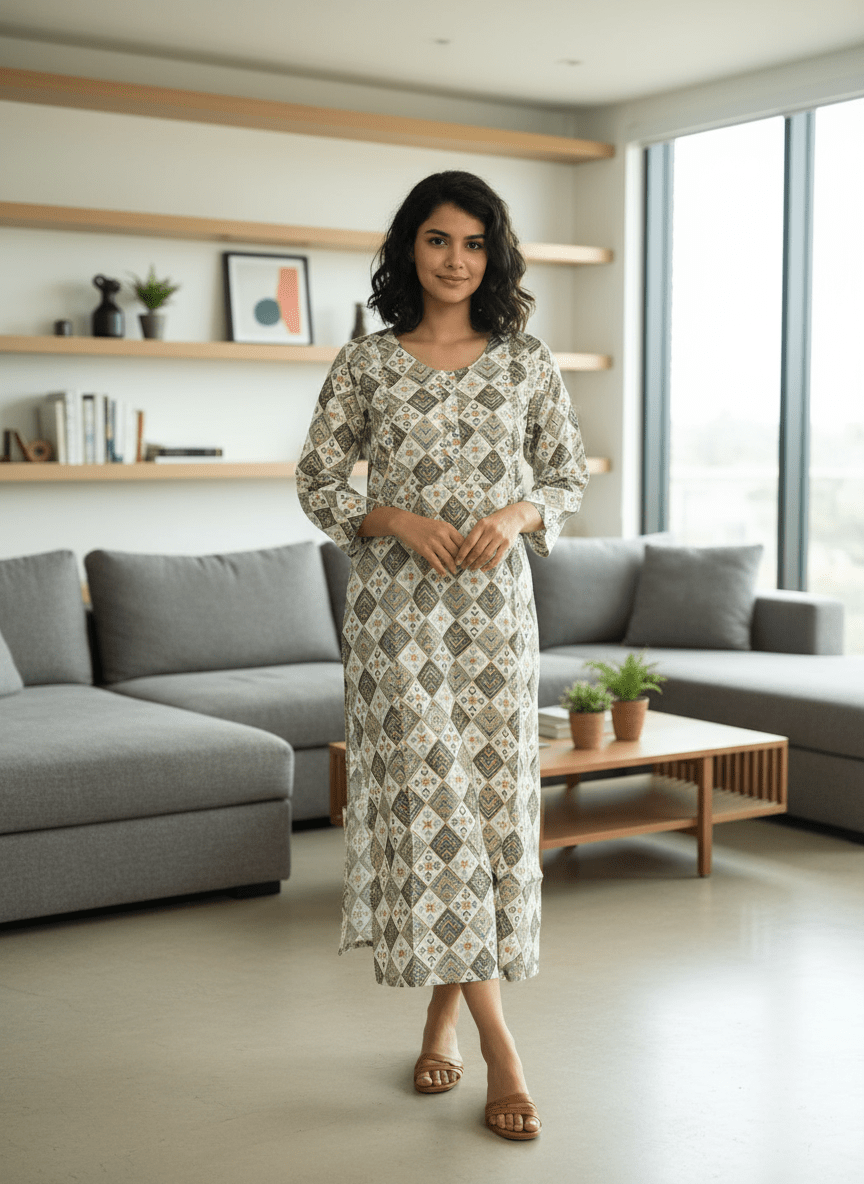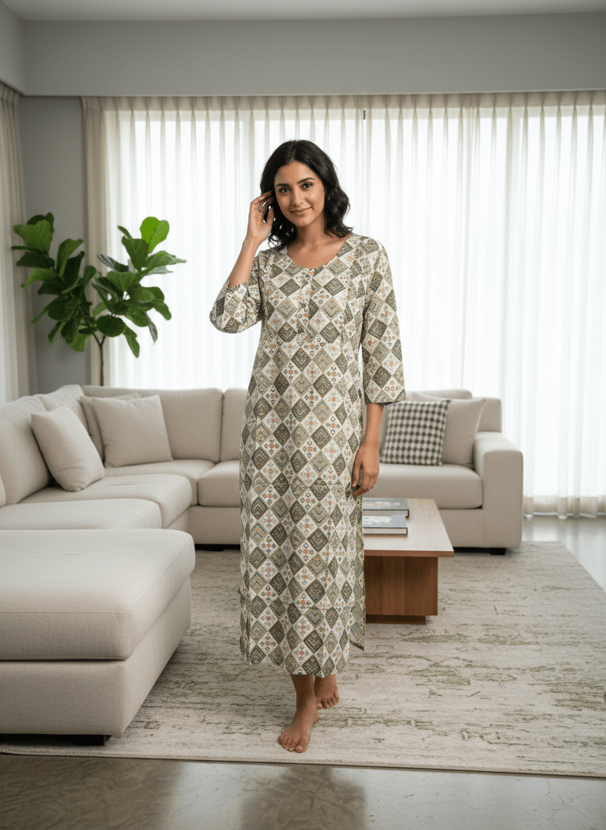Crafted in breathable cotton, this kurta is a quiet celebration of motherhood’s rhythm. The earthy palette of green, beige, and ivory dances across a diamond-inspired print, offering visual calm and timeless charm. Thoughtfully placed feeding zippers on both sides ensure easy nursing access while maintaining a seamless silhouette. The relaxed fit and ankle-length drape allow for movement and comfort, whether you’re cradling your little one or catching a moment of stillness. This piece is more than maternitywear—it’s a companion for your journey, blending softness, privacy, and style in every thread.
