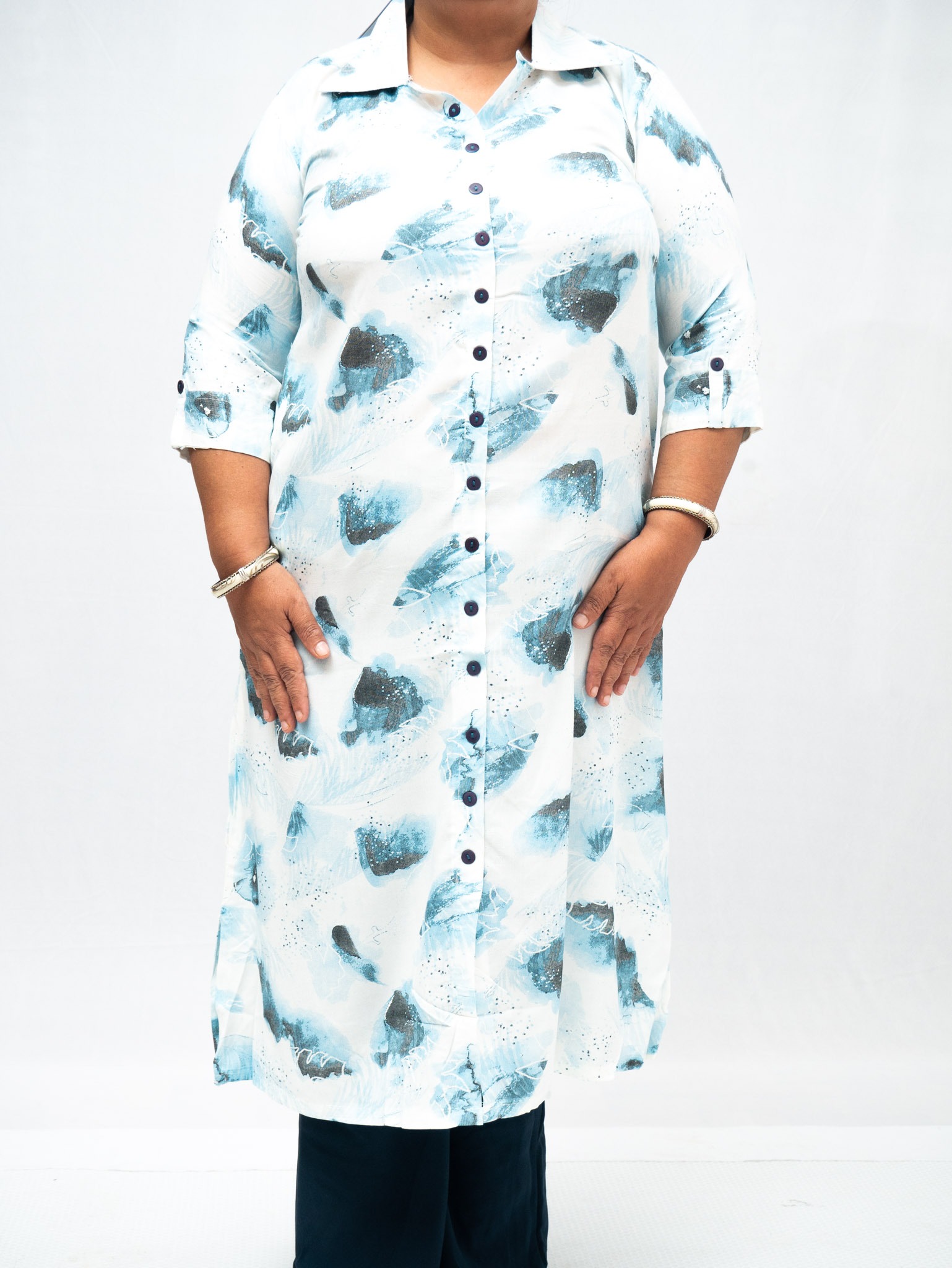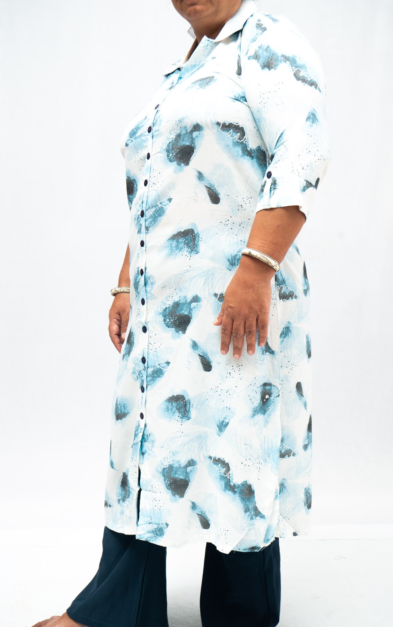 Make a statement in this contemporary shirt dress that blends artistic flair with everyday comfort. The pristine white base is adorned with abstract blue brushstroke patterns, evoking the calm of ocean waves and the spontaneity of watercolor art. Its full button-down front, dark contrast buttons, and structured collar lend a tailored edge, while the relaxed silhouette ensures ease of movement and breathability.