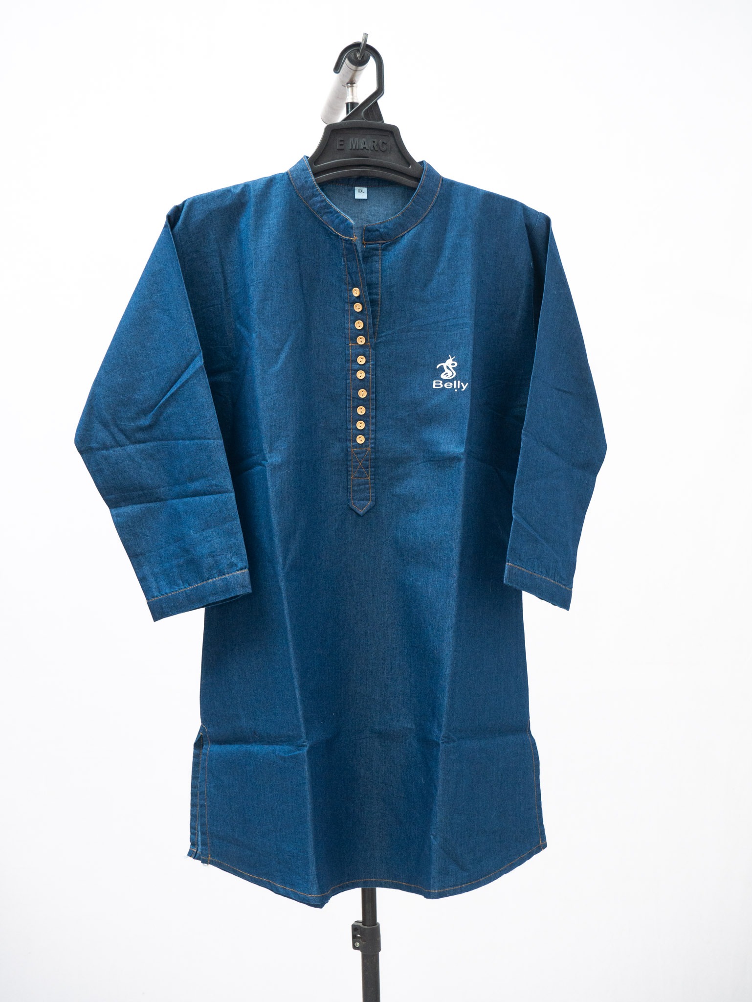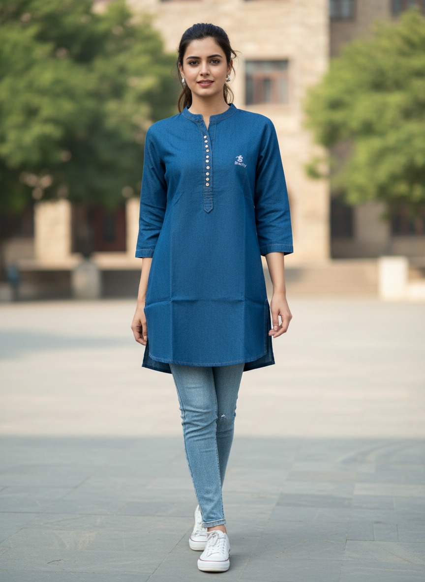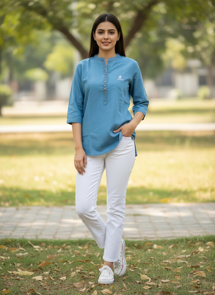 Step into effortless everyday style with this light blue denim short kurti, designed for women who love a clean, modern look with all-day comfort. The breathable denim fabric and relaxed straight cut make it ideal for daily wear, whether you are heading to college, work, or a casual outing. A neat Mandarin collar and front button placket with wooden-style buttons add a chic touch, while the 3/4 sleeves offer easy movement and coverage in any season.